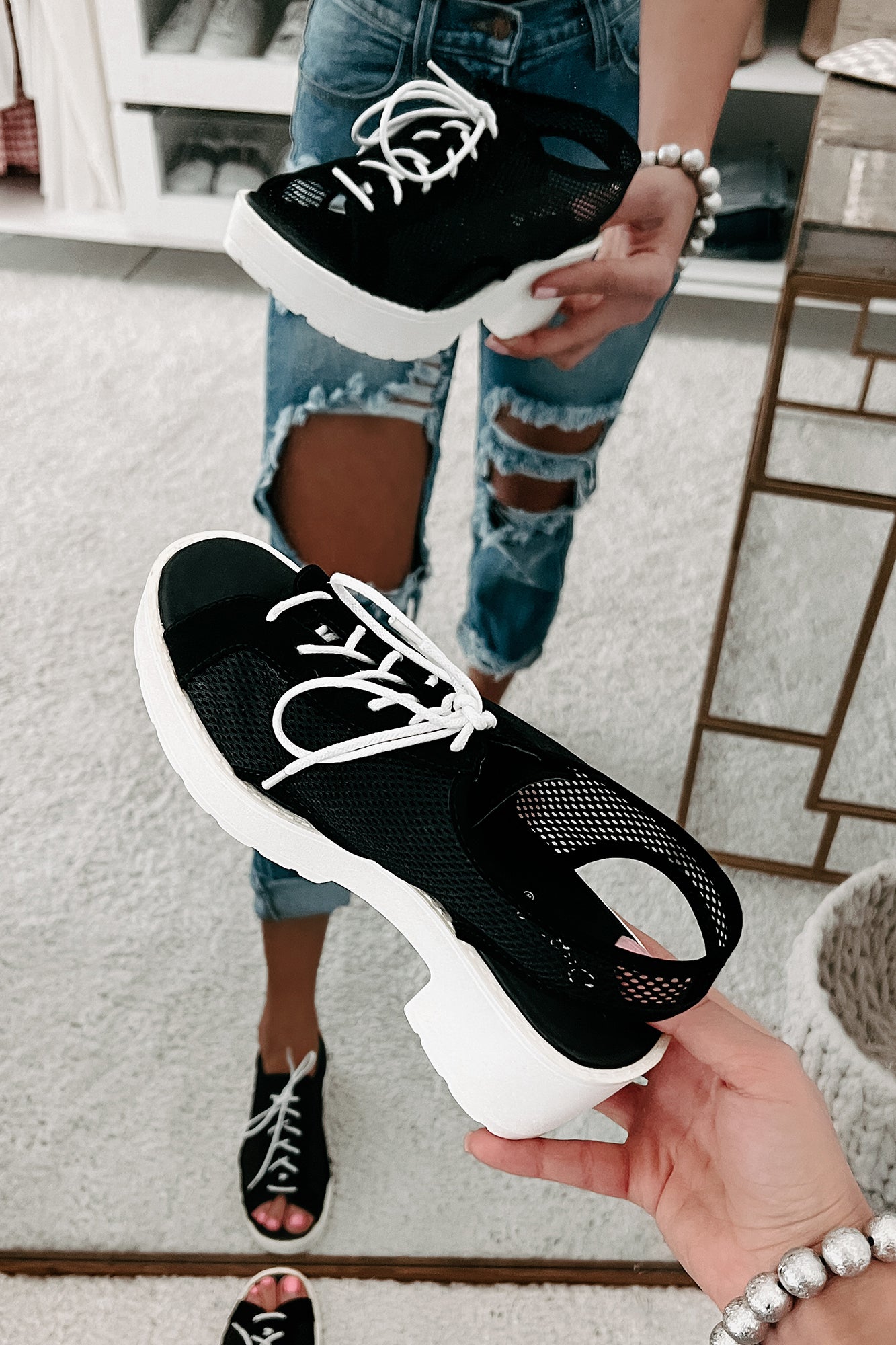 Stride in style with this one-of-a-kind, black slingback sandal! Its unique mesh material and lace-up design create a distinctive, summer look that's sure to turn heads. Plus the 1" platform sole and 2.5" heel gives you comfortable sophistication - perfect for any occasion!